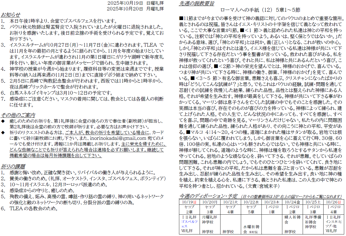 ■〈16節〉「そのようなわけで」とは13節「世界の相続人」。アダムとエバがこの地を相続せよと語られた相続人であったように、イエス・キリストを信じる者が世界の相続人となるということ。それはどこから始まったか。創世記17:3-5、17:11参照。99歳の時にアブラハムは多くの国の父となると約束され、神様がイスラエル民族とアブラハム契約を結んだ。この流れをまず知っておいて頂きたい。■〈17-22節〉アブラハムは信じたゆえに義とされた。アブラハムが100歳になってサラも妊娠することができないと分かっていても信じた。今日は義という部分と共に、信仰という部分に関してお話したい。アブラハムの信仰とは何か。信仰には2種類ある。マタイ17:19―20に「薄い信仰」と「からし種の信仰」というのが出てくる。私は昔、薄い信仰が成長したらからし種の信仰に変わると思っていた。しかし薄い信仰の対比は厚い信仰。マタイ8:26でイエス様は向こう岸に行こうと弟子たちに約束した。船を漕ぎだして嵐になった。怖くなって助けて下さいと叫んだ弟子たちに、イエス様は「なぜこわがるのか。信仰の薄い者たちだ」と言われた。アブラハムが持っていた信仰は、自分もサラも年老いてもう子供を産むことは無理だと思っても神様の言葉は成ると信じた。つまり、状況があり得なかったとしても、神がこう語ったから成ると信じた。からし種のようにどんなに小さな信仰でも、受けたと信じるときそれが成っていく。■〈22-25節〉私たちは、アブラハムの信仰を神様によって受け、用いることができる。私達が神様の義を受けるためにイエス様の十字架があり、神の言葉を信じることを導くために、神様がイエス様をよみがえらせた。ただ前もって言っておきたい。何でもかんでも信じたらそのようになるのではない。神様が語られた言葉を受け取って信じたら成る。日本に鰯の頭も信心からという言葉がある。違うものを信じてはだめ。神の言葉を信じる。確認し吟味する。祈る。交わる。み言葉を読む。このことを通して私たちは神様の言葉を受けていく。私は受けれられないという人がいるなら、こう祈ることをお勧めする。「神様、私が正しく神様の言を受け取ることができるように神様が導いてください」。受けたと信じる信仰とは、私たちの力でするのではない。聖霊様によってさせて頂く。それゆえ吟味が必要。本当に神が語られているのか。ここがカギとなる。受けたと信じる信仰を通して、私たちは神の奇跡を見ていくことを覚え頂きたい。(文責 フィベ知念)