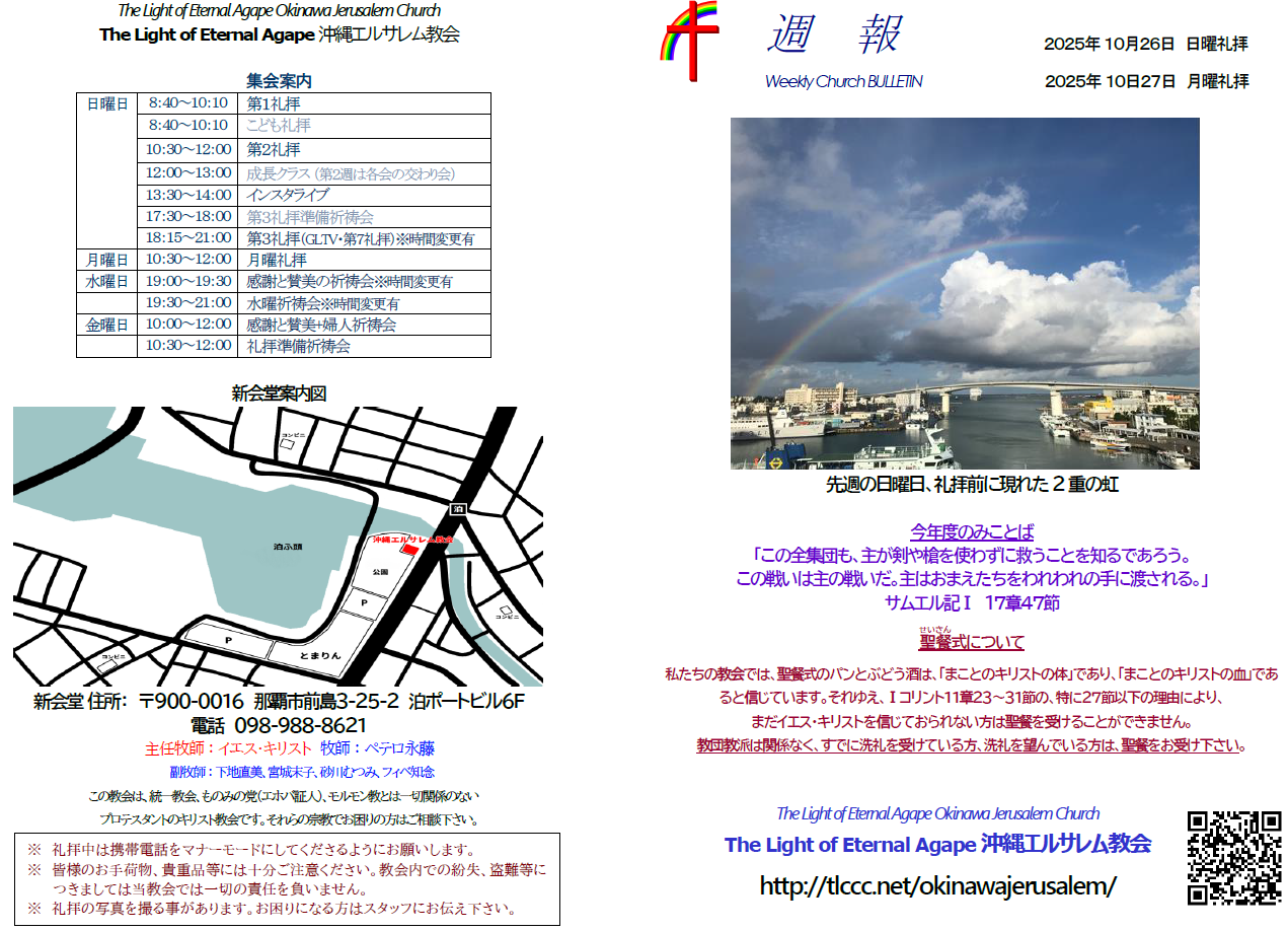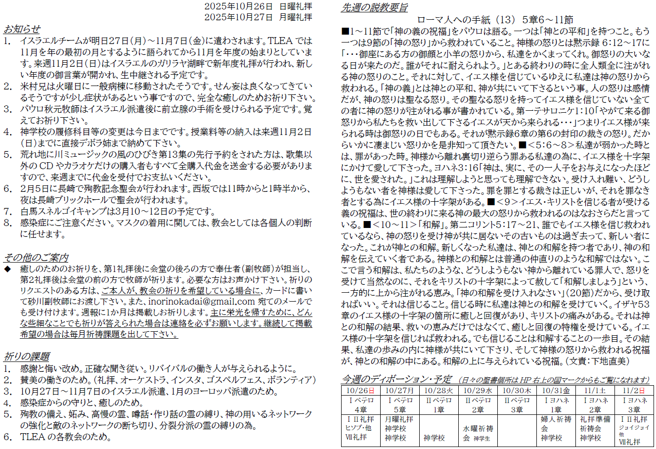 ■1~11節で「神の義の祝福」をパウロは語る。一つは「神との平和」を持つこと。もう一つは9節の「神の怒り」から救われていること。神様の怒りとは黙示録 6:12~17に「・・・御座にある方の御顔と小羊の怒りから、私達をかくまってくれ。御怒りの大いなる日が来たのだ。誰がそれに耐えられよう。」とある終わりの時に全人類全に注がれる神の怒りのこと。それに対して、イエス様を信じているゆえに私達は神の怒りから救われる。「神の義」とは神との平和、神が共にいて下さるという事。人の怒りは感情だが、神の怒りは聖なる怒り。その聖なる怒りを持ってイエス様を信じていない全ての者に神の怒りが注がれる事が書かれている。第一テサロニケ1:10「やがて来る御怒りから私たちを救い出して下さるイエスが天から来られる・・・」つまりイエス様が来られる時は御怒りの日でもある。それが黙示録6章の第6の封印の裁きの怒り。だからいかに凄まじい怒りかを是非知って頂きたい。■<5:6~8>私達が弱かった時とは、罪があった時。神様から離れ裏切り逆らう罪ある私達の為に、イエス様を十字架にかけて愛して下さった。ヨハネ3:16「神は、実に、その一人子をお与えになったほどに、世を愛された。」これは理解しようと思っても理解できない。受け入れ難い、どうしようもない者を神様は愛して下さった。罪を罪とする裁きは正しいが、それを罪なき者とする為にイエス様の十字架がある。■<9>イエス・キリストを信じる者が受ける義の祝福は、世の終わりに来る神の最大の怒りから救われるのはなおさらだと言っている。■<10~11>「和解」。第二コリント5:17~21、誰でもイエス様を信じ救われているなら、神の怒りを受け神が共に居ないその古いものは過ぎ去って、新しい者になった。これが神との和解。新しくなった私達は、神との和解を持つ者であり、神の和解を伝えていく者である。神様との和解とは普通の仲直りのような和解ではない。ここで言う和解は、私たちのような、どうしようもない神から離れている罪人で、怒りを受けて当然なのに、それをキリストの十字架によって赦して「和解しましょう」という、一方的に上から注がれる恵み。「神の和解を受け入れなさい」(20節)だから、受け取ればいい。それは信じること。信じる時に私達は神との和解を受けていく。イザヤ53章のイエス様の十字架の箇所に癒しと回復があり、キリストの痛みがある。それは神との和解の結果、救いの恵みだけではなくて、癒しと回復の特権を受けている。イエス様の十字架を信じれば救われる。でも信じることは和解することの一歩目。その結果、私達の歩みの内に神様が共にいて下さり、そして神様の怒りから救われる祝福が、神との和解の中にある。和解の上に与えられている祝福。(文責:下地直美)